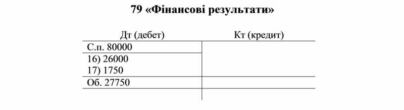 16. Списано на фінансовий результат адміністративні витрати – 26000 грн.: Дебет рахунка 79 «Фінансовий результат»