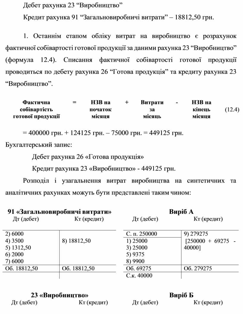 9. Останнім етапом обліку витрат на виробництво є розрахунок фактичної собівартості готової продукції за даними рахунка 23 “Виробництво” (формула 12.4). Списання фактичної собівартості готової продукції проводиться по дебету рахунка 26 “Готова продукція” та кредиту рахунка 23 “Виробництво”.