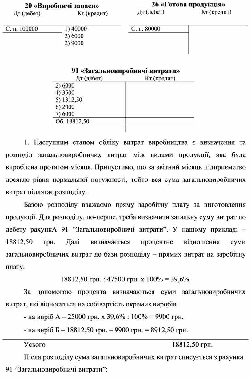Базою розподілу вважаємо пряму заробітну плату за виготовлення продукції. Для розподілу, по-перше, треба визначити загальну суму витрат по дебету рахункА 91 “Загальновиробничі витрати”. У нашому прикладі – 18812,50 грн. Далі визначається процентне відношення суми загальновиробничих витрат до бази розподілу – прямих витрат на заробітну плату: