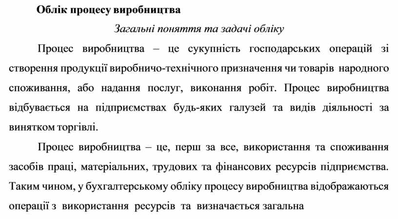 Процес виробництва – це, перш за все, використання та споживання засобів праці, матеріальних, трудових та фінансових ресурсів підприємства. Таким чином, у бухгалтерському обліку процесу виробництва відображаються операції з використання ресурсів та визначається загальна