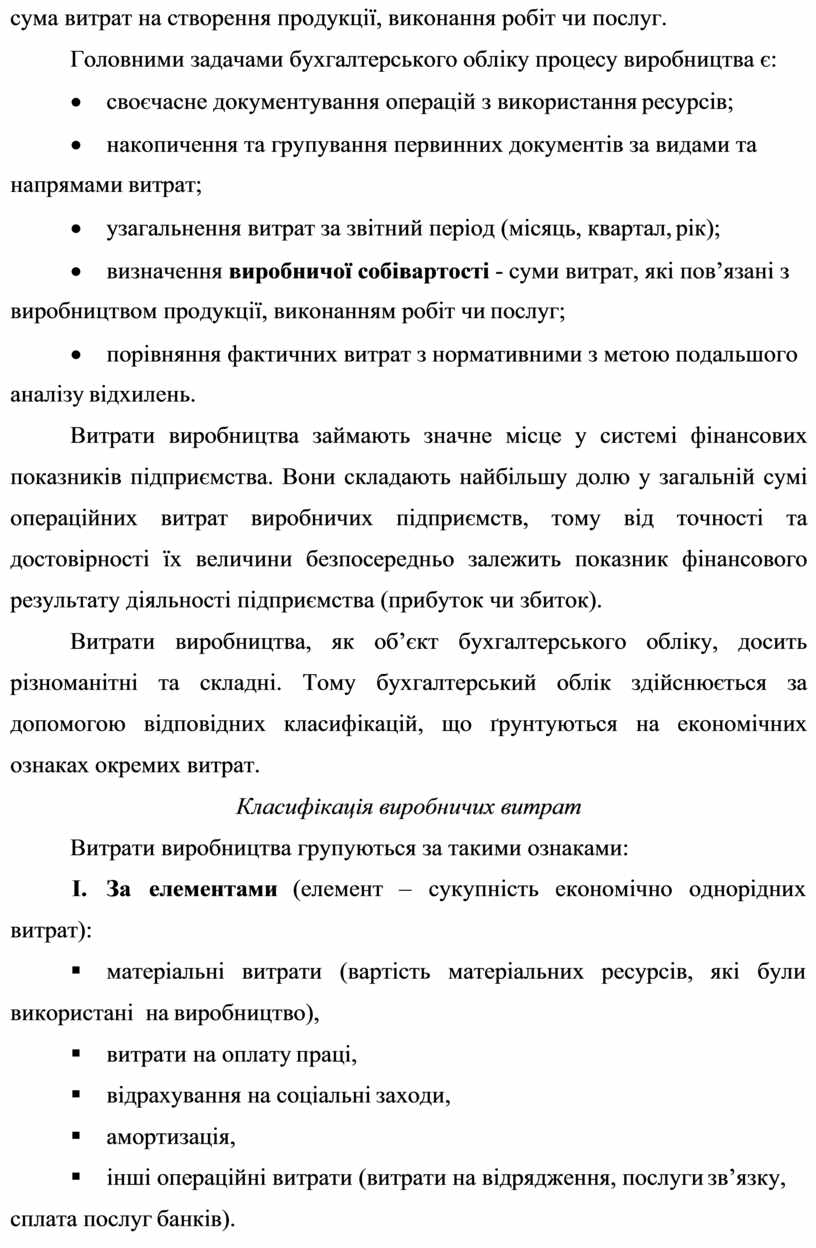 Витрати виробництва займають значне місце у системі фінансових показників підприємства. Вони складають найбільшу долю у загальній сумі операційних витрат виробничих підприємств, тому від точності та достовірності їх величини безпосередньо залежить показник фінансового результату діяльності підприємства (прибуток чи збиток).