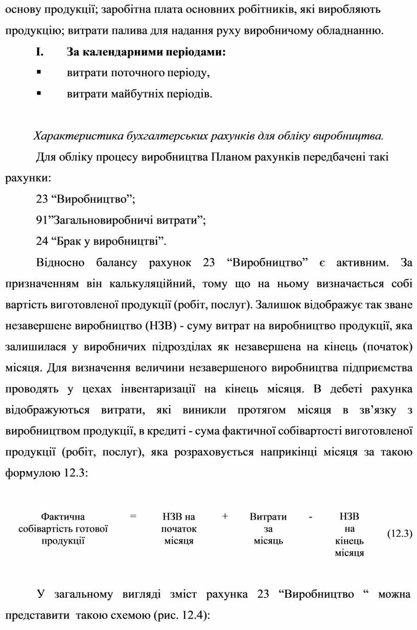 Відносно балансу рахунок 23 “Виробництво” є активним. За призначенням він калькуляційний, тому що на ньому визначається собі вартість виготовленої продукції (робіт, послуг). Залишок відображує так зване незавершене виробництво (НЗВ) - суму витрат на виробництво продукції, яка залишилася у виробничих підрозділах як незавершена на кінець (початок) місяця. Для визначення величини незавершеного виробництва підприємства проводять у цехах інвентаризації на кінець місяця. В дебеті рахунка відображуються витрати, які виникли протягом місяця в зв’язку з виробництвом продукції, в кредиті - сума фактичної собівартості виготовленої продукції (робіт, послуг), яка розраховується наприкінці місяця за такою формулою 12.3: