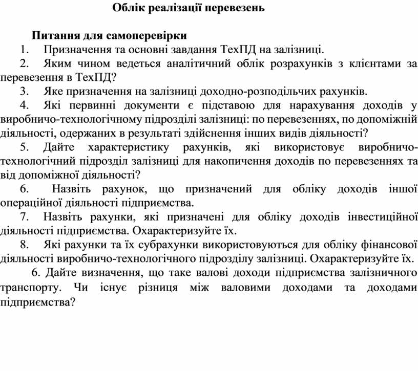 5. Дайте характеристику рахунків, які використовує виробничо-технологічний підрозділ залізниці для накопичення доходів по перевезеннях та від допоміжної діяльності?