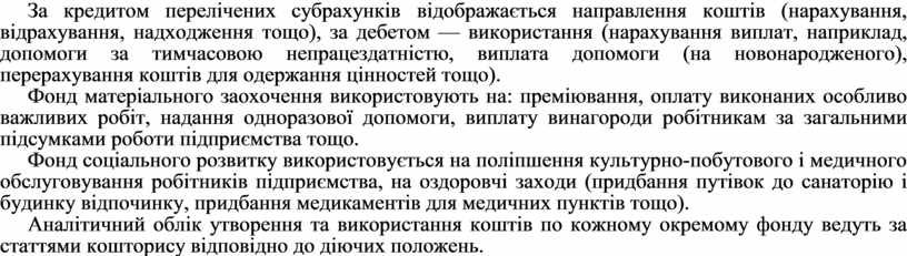 За кредитом перелічених субрахунків відображається направлення коштів (нарахування, відрахування, надходження тощо), за дебетом — використання (нарахування виплат, наприклад, допомоги за тимчасовою непрацездатністю, виплата допомоги (на новонародженого), перерахування коштів для одержання цінностей тощо).
