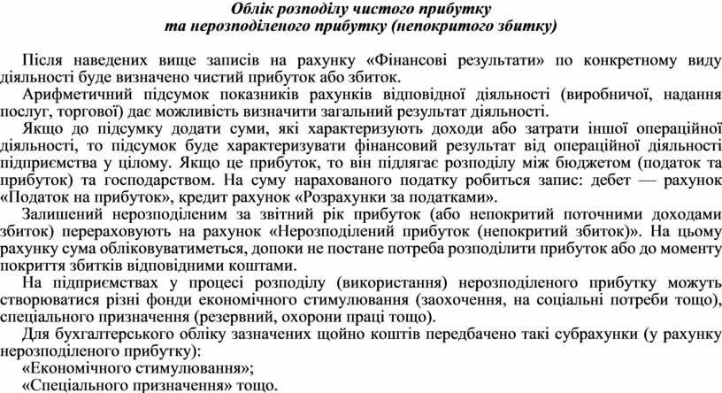 Для бухгалтерського обліку зазначених щойно коштів передбачено такі субрахунки (у рахунку нерозподіленого прибутку):