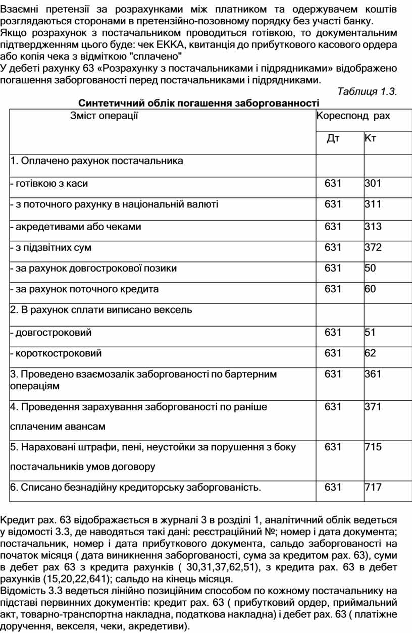 Кредит рах. 63 відображається в журналі 3 в розділі 1, аналітичний облік ведеться у відомості 3.3, де наводяться такі дані: реєстраційний №; номер і дата документа; постачальник, номер і дата прибуткового документа, сальдо заборгованості на початок місяця ( дата виникнення заборгованості, сума за кредитом рах. 63), суми в дебет рах 63 з кредита рахунків ( 30,31,37,62,51), з кредита рах. 63 в дебет рахунків (15,20,22,641); сальдо на кінець місяця.