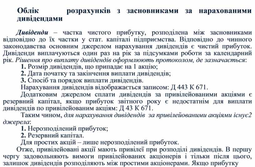 Дивіденди – частка чистого прибутку, розподілена між засновниками відповідно до їх частки у стат. капіталі підприємства. Відповідно до чинного законодавства основним джерелом нарахування дивідендів є чистий прибуток. Дивіденди виплачуються один раз на рік за підсумками роботи за календарний рік. Рішення про виплату дивідендів оформлюють протоколом, де зазначається: