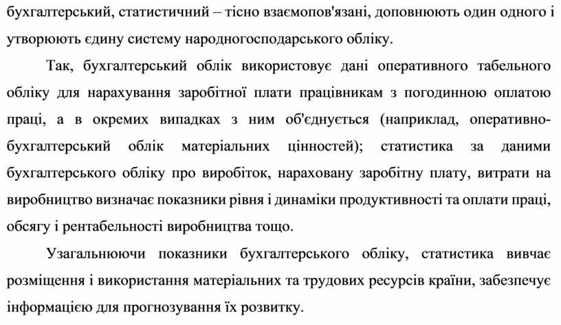 Так, бухгалтерський облік використовує дані оперативного табельного обліку для нарахування заробітної плати працівникам з погодинною оплатою праці, а в окремих випадках з ним об'єднується (наприклад, оперативно- бухгалтерський облік матеріальних цінностей); статистика за даними бухгалтерського обліку про виробіток, нараховану заробітну плату, витрати на виробництво визначає показники рівня і динаміки продуктивності та оплати праці, обсягу і рентабельності виробництва тощо.