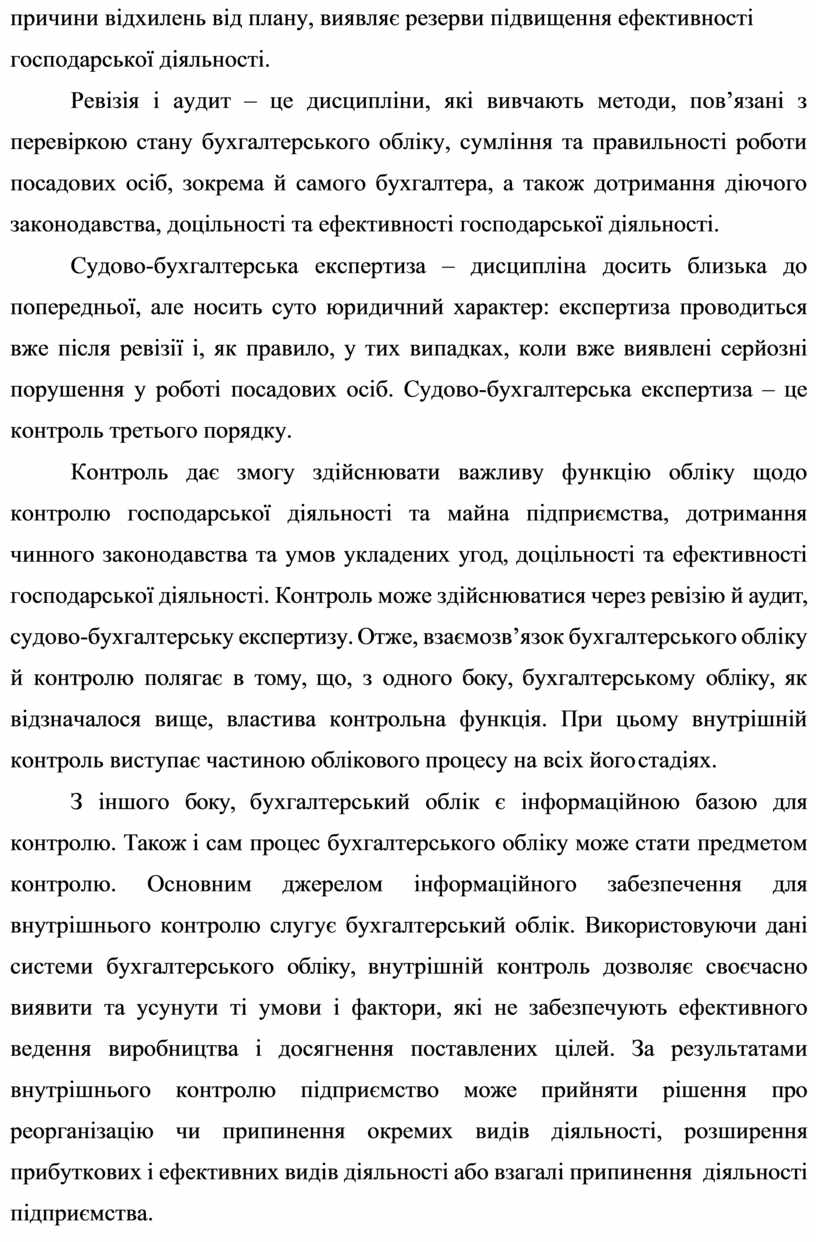 Контроль дає змогу здійснювати важливу функцію обліку щодо контролю господарської діяльності та майна підприємства, дотримання чинного законодавства та умов укладених угод, доцільності та ефективності господарської діяльності. Контроль може здійснюватися через ревізію й аудит, судово-бухгалтерську експертизу. Отже, взаємозв’язок бухгалтерського обліку й контролю полягає в тому, що, з одного боку, бухгалтерському обліку, як відзначалося вище, властива контрольна функція. При цьому внутрішній контроль виступає частиною облікового процесу на всіх його стадіях.