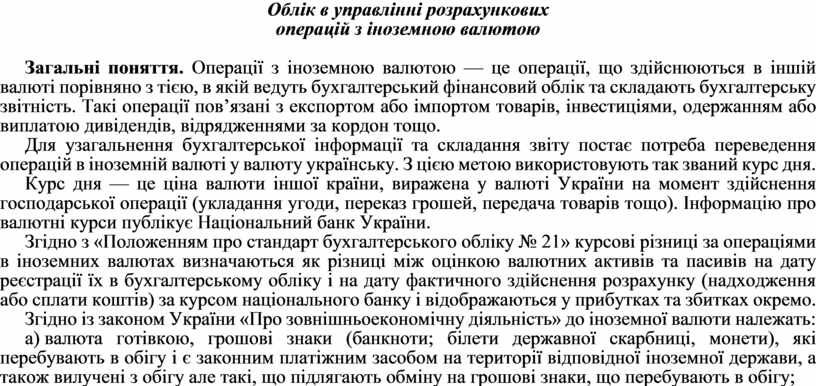 Загальні поняття. Операції з іноземною валютою — це операції, що здійснюються в іншій валюті порівняно з тією, в якій ведуть бухгалтерський фінансовий облік та складають бухгалтерську звітність. Такі операції пов’язані з експортом або імпортом товарів, інвестиціями, одержанням або виплатою дивідендів, відрядженнями за кордон тощо.
