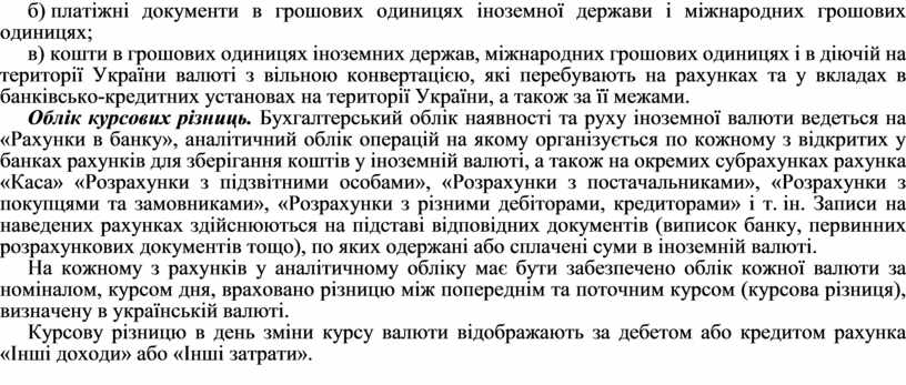 Облік курсових різниць. Бухгалтерський облік наявності та руху іноземної валюти ведеться на «Рахунки в банку», аналітичний облік операцій на якому організується по кожному з відкритих у банках рахунків для зберігання коштів у іноземній валюті, а також на окремих субрахунках рахунка «Каса» «Розрахунки з підзвітними особами», «Розрахунки з постачальниками», «Розрахунки з покупцями та замовниками», «Розрахунки з різними дебіторами, кредиторами» і т. ін. Записи на наведених рахунках здійснюються на підставі відповідних документів (виписок банку, первинних розрахункових документів тощо), по яких одержані або сплачені суми в іноземній валюті.