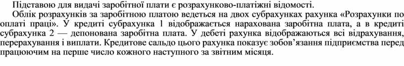 Облік розрахунків за заробітною платою ведеться на двох субрахунках рахунка «Розрахунки по оплаті праці». У кредиті субрахунка 1 відображається нарахована заробітна плата, а в кредиті субрахунка 2 — депонована заробітна плата. У дебеті рахунка відображаються всі відрахування, перерахування і виплати. Кредитове сальдо цього рахунка показує зобов’язання підприємства перед працюючим на перше число кожного наступного за звітним місяця.