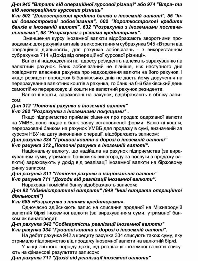 Облік за цим рахунком ведуть аналогічно до того, як і за поточним рахунком у національній валюті. Особливістю є те, що записи операцій здійснюють в облікових реєстрах з обліку розрахунків у чисельнику в іно- земній валюті, а в знаменнику – у гривнях за курсом Нацбанку на відпові- дну дату, а основним документом, за яким здійснюють придбання валют- них коштів та їхнє списання з цього рахунку, є заява встановленої форми. Виписки банк видає за цим рахунком одночасно у розрізі валют та у грив- нях.