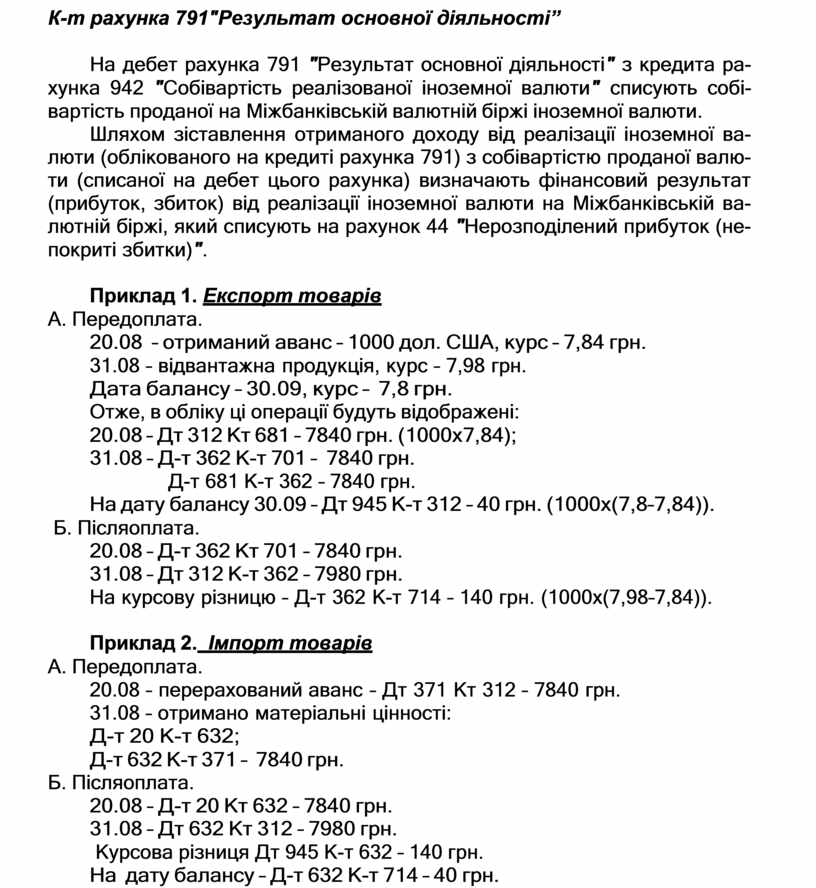 На дебет рахунка 791 "Результат основної діяльності" з кредита ра- хунка 942 "Собівартість реалізованої іноземної валюти" списують собі- вартість проданої на Міжбанківській валютній біржі іноземної валюти.