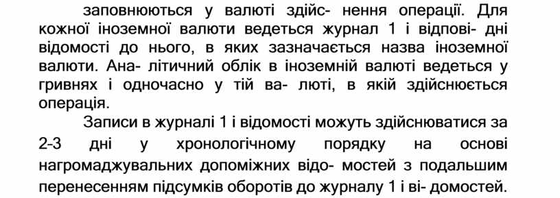 Для відображення операцій, здійснених в іноземній валюті, викорис- товують журнал 1 і відомості до нього, які заповнюються у валюті здійс- нення операції. Для кожної іноземної валюти ведеться журнал 1 і відпові- дні відомості до нього, в яких зазначається назва іноземної валюти. Ана- літичний облік в іноземній валюті ведеться у гривнях і одночасно у тій ва- люті, в якій здійснюється операція.