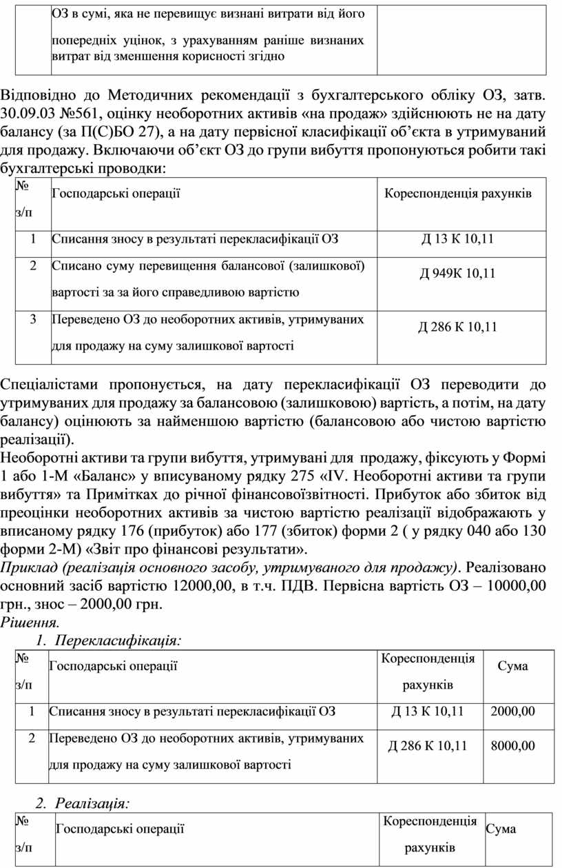Відповідно до Методичних рекомендації з бухгалтерського обліку ОЗ, затв. 30.09.03 №561, оцінку необоротних активів «на продаж» здійснюють не на дату балансу (за П(С)БО 27), а на дату первісної класифікації об’єкта в утримуваний для продажу. Включаючи об’єкт ОЗ до групи вибуття пропонуються робити такі бухгалтерські проводки: