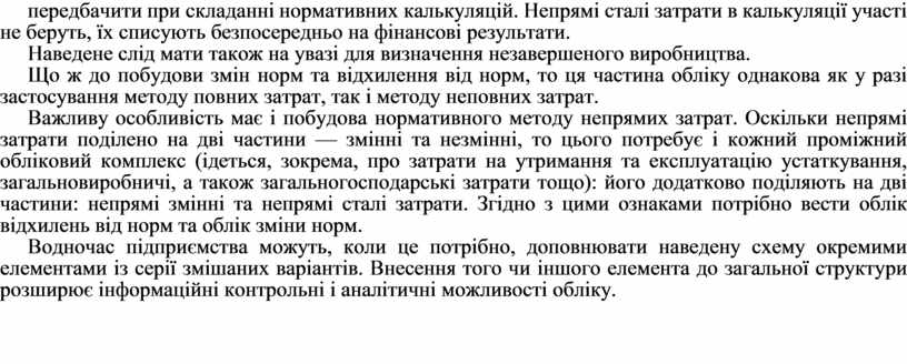 Важливу особливість має і побудова нормативного методу непрямих затрат. Оскільки непрямі затрати поділено на дві частини — змінні та незмінні, то цього потребує і кожний проміжний обліковий комплекс (ідеться, зокрема, про затрати на утримання та експлуатацію устаткування, загальновиробничі, а також загальногосподарські затрати тощо): його додатково поділяють на дві частини: непрямі змінні та непрямі сталі затрати. Згідно з цими ознаками потрібно вести облік відхилень від норм та облік зміни норм.