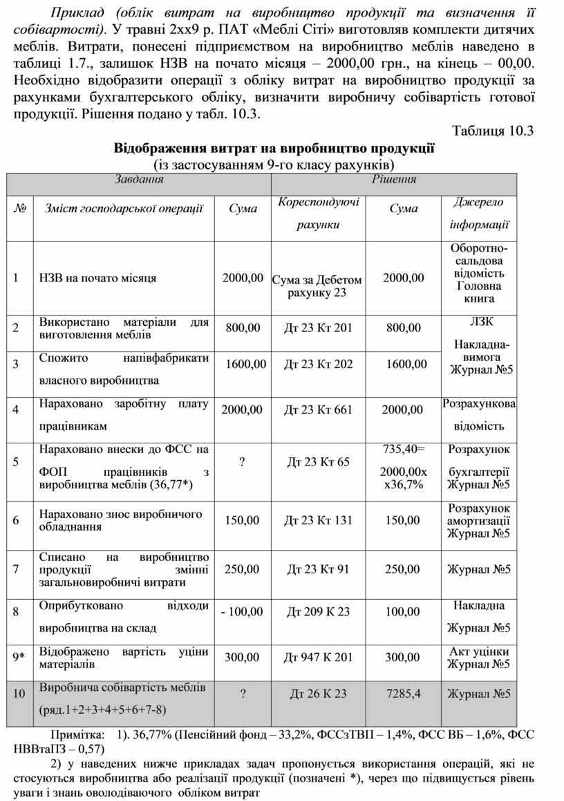 Приклад (облік витрат на виробництво продукції та визначення її собівартості). У травні 2хх9 р. ПАТ «Меблі Сіті» виготовляв комплекти дитячих меблів. Витрати, понесені підприємством на виробництво меблів наведено в таблиці 1.7., залишок НЗВ на почато місяця – 2000,00 грн., на кінець – 00,00. Необхідно відобразити операції з обліку витрат на виробництво продукції за рахунками бухгалтерського обліку, визначити виробничу собівартість готової продукції. Рішення подано у табл. 10.3.