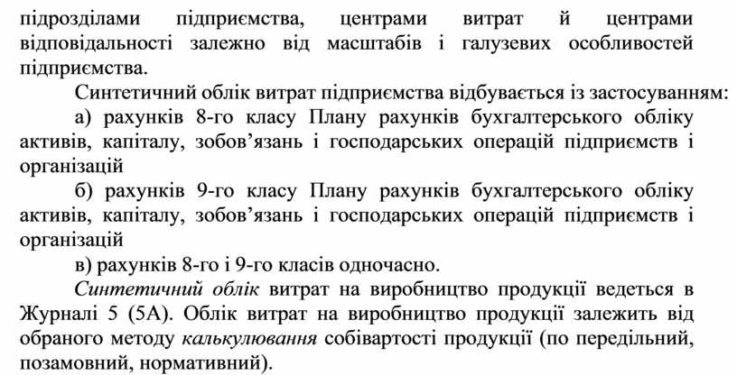 Аналітичний облік витрат підприємства ведеться за видами виробництв, статтями й елементами витрат, видами продукції й виконаними роботами,