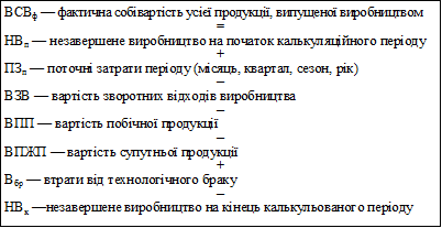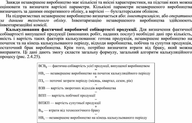 Калькулювання фактичної виробничої собівартості продукції. Для визначення фактичної собівартості випущеної продукції (виконаних робіт, наданих послуг) необхідні дані про кількість, якість і вартість таких факторів калькулювання: готова продукція, незавершене виробництво на початок та на кінець калькульованого періоду, відходи виробництва, побічна та супутня продукція, остаточний брак виробництва. Крім того, потрібно визначити втрати від браку, який можна виправити. Ці дані дають змогу скласти загальну формулу, загальний алгоритм калькуляційного процесу (рис. 2.4.25).