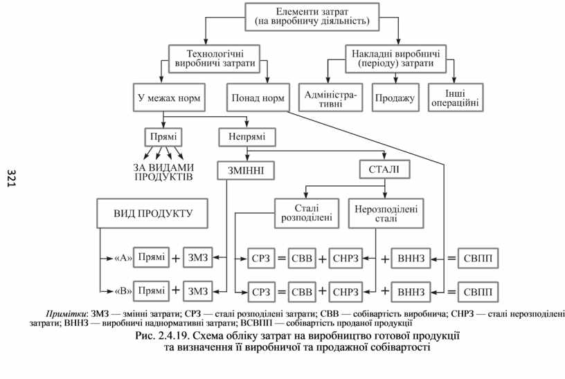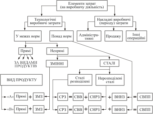 Примітки: ЗМЗ — змінні затрати; СРЗ — сталі розподілені затрати; СВВ — собівартість виробнича; СНРЗ — сталі нерозподілені затрати; ВННЗ — виробничі наднормативні затрати; ВСВПП — собівартість проданої продукції