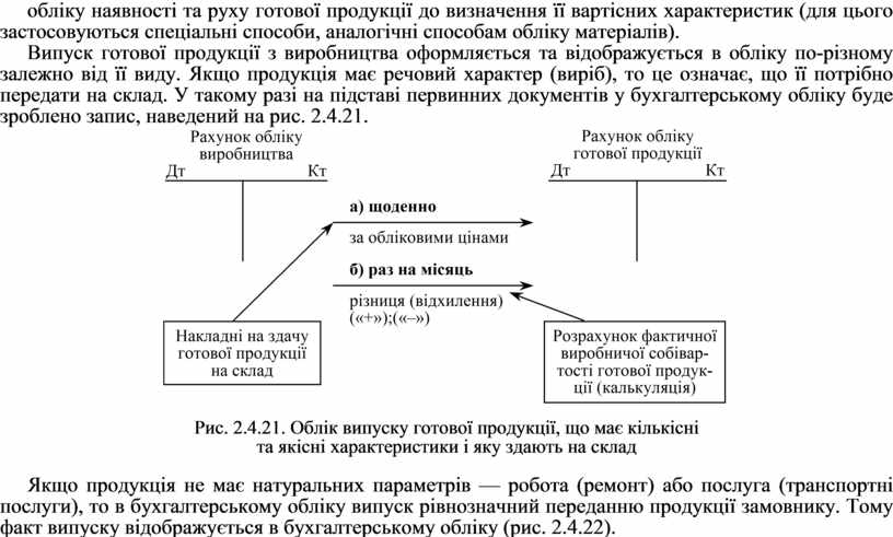 Випуск готової продукції з виробництва оформляється та відображується в обліку по-різному залежно від її виду. Якщо продукція має речовий характер (виріб), то це означає, що її потрібно передати на склад. У такому разі на підставі первинних документів у бухгалтерському обліку буде зроблено запис, наведений на рис. 2.4.21.