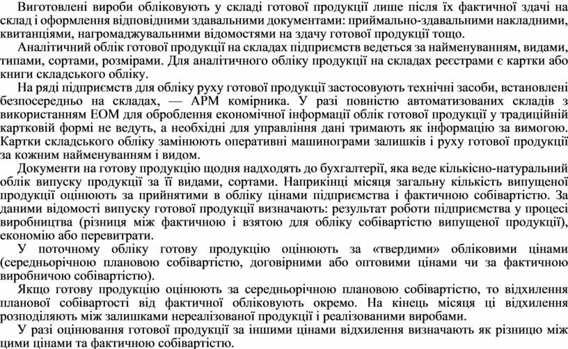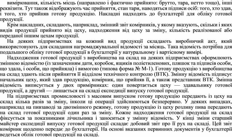 Облік наявності та руху готової продукції на підприємствах (на складах і в бухгалтерії). Вихід кожного виду готової продукції або напівфабрикатів з виробництва оформляється відповідною первинною документацією — частіше приймально-здавальними накладними. У них зазначають номер, дату, цех (відправник), склад (одержувач), найменування продукції, одиницю вимірювання, кількість місць (направлено і фактично прийнято: брутто, тара, нетто тощо), інші реквізити. Тут також відображують час прийняття, стан тари, наводяться підписи осіб: того, хто здав, і того, хто прийняв готову продукцію. Накладні надходять до бухгалтерії для обліку готової продукції.