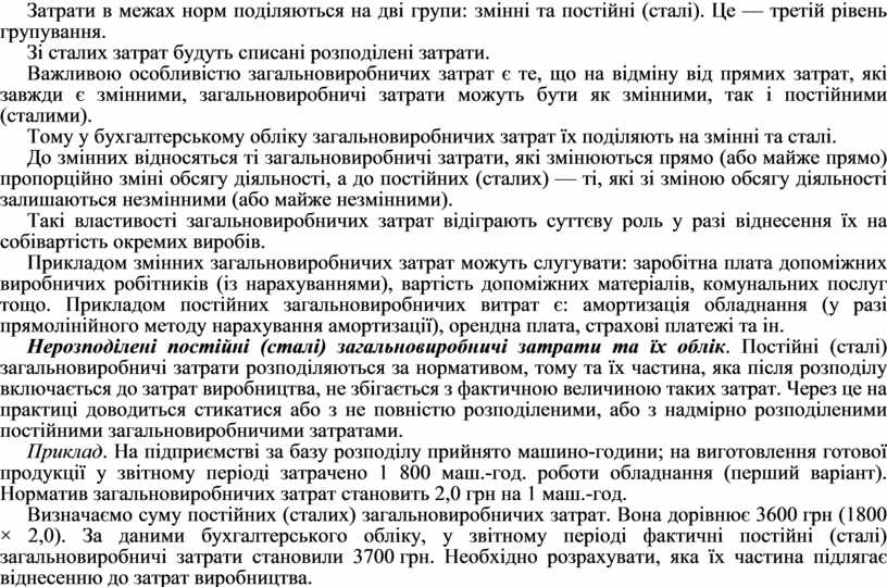Якщо ж за інших рівних умов для виготовлення готової продукції знадобиться, наприклад, 2000 маш.-год. роботи обладнання, то сума розподілених за нормативом постійних загальновиробничих затрат становитиме 4000 грн (2000 × 2,0), і матимуть місце із надмірно розподілені постійні загальновиробничі затрати в сумі — 300 грн (3700 – 4000).