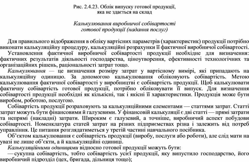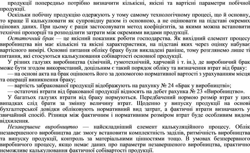 Аналогічні натуральні (кількісні та якісні) характеристики мають й інші вихідні елементи виробництва: відходи, брак, незавершене виробництво. Усі вихідні елементи процесу виробництва стають об’єктами калькулювання фактичної собівартості готової продукції. Їх наявність або відсутність ускладнює або полегшує (спрощує) процедуру калькулювання, а поєднання визначає його метод (або спосіб).