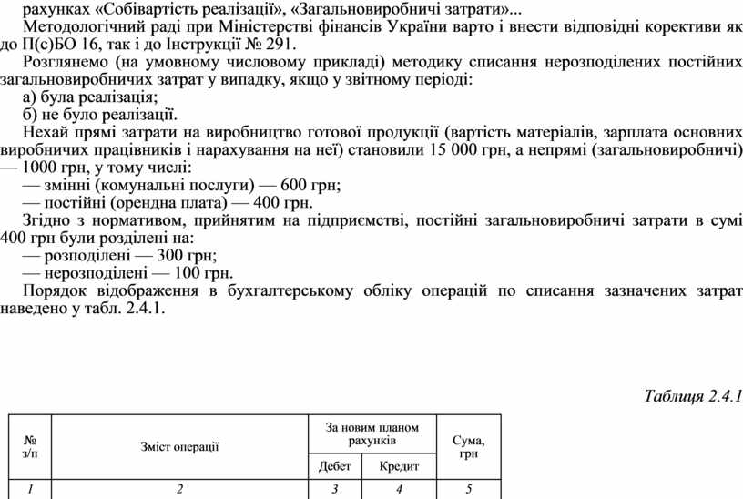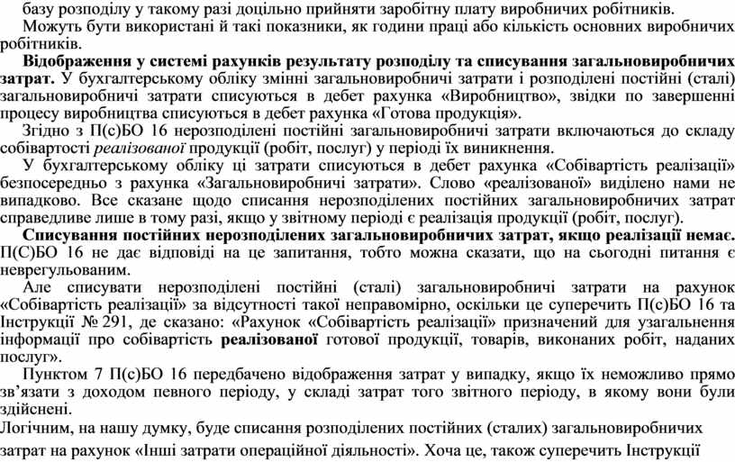 Логічним, на нашу думку, буде списання розподілених постійних (сталих) загальновиробничих затрат на рахунок «Інші затрати операційної діяльності». Хоча це, також суперечить Інструкції № 291, згідно з якою на рахунку «Інші затрати операційної діяльності» ведеться облік затрат операційної діяльності підприємства, крім затрат, які відображуються на рахунках «Собівартість реалізації», «Загальновиробничі затрати»...