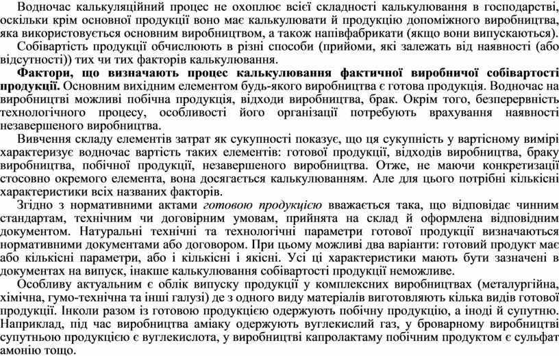 Фактори, що визначають процес калькулювання фактичної виробничої собівартості продукції. Основним вихідним елементом будь-якого виробництва є готова продукція. Водночас на виробництві можливі побічна продукція, відходи виробництва, брак. Окрім того, безперервність технологічного процесу, особливості його організації потребують врахування наявності незавершеного виробництва.