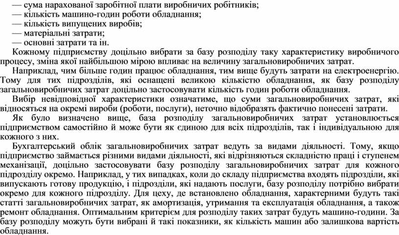 Кожному підприємству доцільно вибрати за базу розподілу таку характеристику виробничого процесу, зміна якої найбільшою мірою впливає на величину загальновиробничих затрат.