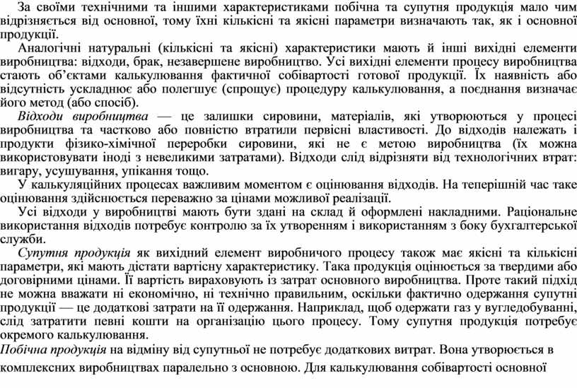 Наявність відходів виробництва спричинює необхідність виключення їхньої вартості із загальної суми затрат, супутньої продукції — необхідність обліку затрат на її одержання, а побічної продукції — розмежування затрат між готовою та побічною продукцією на підставі калькуляції або виключення вартості побічної продукції — якщо вона не калькулюється, її оцінюють на підставі облікових цін.