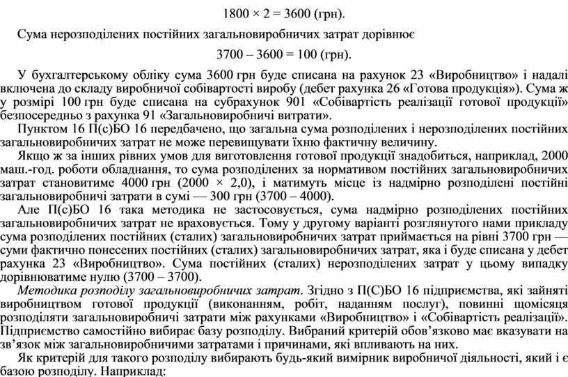 Але П(с)БО 16 така методика не застосовується, сума надмірно розподілених постійних загальновиробничих затрат не враховується. Тому у другому варіанті розглянутого нами прикладу сума розподілених постійних (сталих) загальновиробничих затрат приймається на рівні 3700 грн — суми фактично понесених постійних (сталих) загальновиробничих затрат, яка і буде списана у дебет рахунка 23 «Виробництво». Сума постійних (сталих) нерозподілених затрат у цьому випадку дорівнюватиме нулю (3700 – 3700).