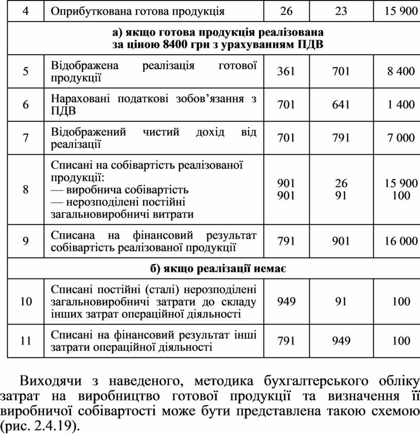 Виходячи з наведеного, методика бухгалтерського обліку затрат на виробництво готової продукції та визначення її виробничої собівартості може бути представлена такою схемою (рис. 2.4.19).