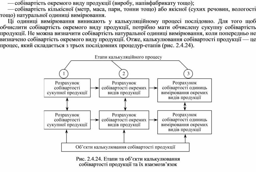 Ці одиниці вимірювання виникають у калькуляційному процесі послідовно. Для того щоб обчислити собівартість окремого виду продукції, потрібно мати обчислену сукупну собівартість продукції. Не можна визначити собівартість натуральної одиниці вимірювання, коли попередньо не визначено собівартість окремого виду продукції. Отже, калькулювання собівартості продукції — це процес, який складається з трьох послідовних процедур-етапів (рис. 2.4.24).