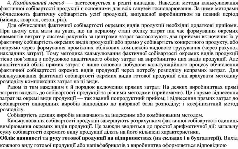 4. Комбінований метод — застосовується в решті випадків. Наведені методи калькулювання фактичної собівартості продукції є основними для всіх галузей господарювання. За цими методами обчислюють фактичну собівартість усієї продукції, випущеної виробництвом за певний період (місяць, квартал, сезон, рік).