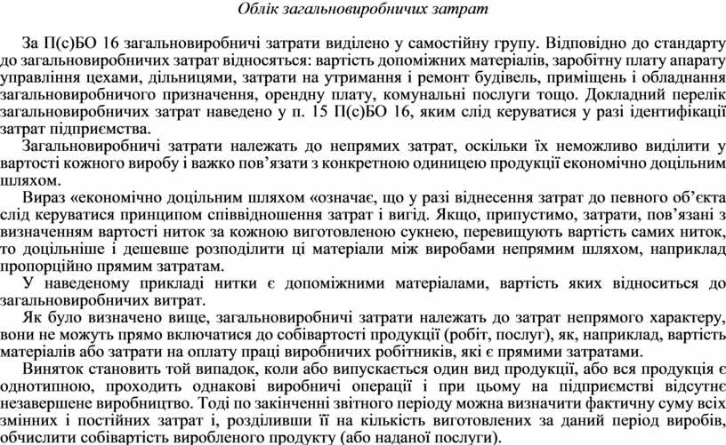 За П(с)БО 16 загальновиробничі затрати виділено у самостійну групу. Відповідно до стандарту до загальновиробничих затрат відносяться: вартість допоміжних матеріалів, заробітну плату апарату управління цехами, дільницями, затрати на утримання і ремонт будівель, приміщень і обладнання загальновиробничого призначення, орендну плату, комунальні послуги тощо. Докладний перелік загальновиробничих затрат наведено у п. 15 П(с)БО 16, яким слід керуватися у разі ідентифікації затрат підприємства.