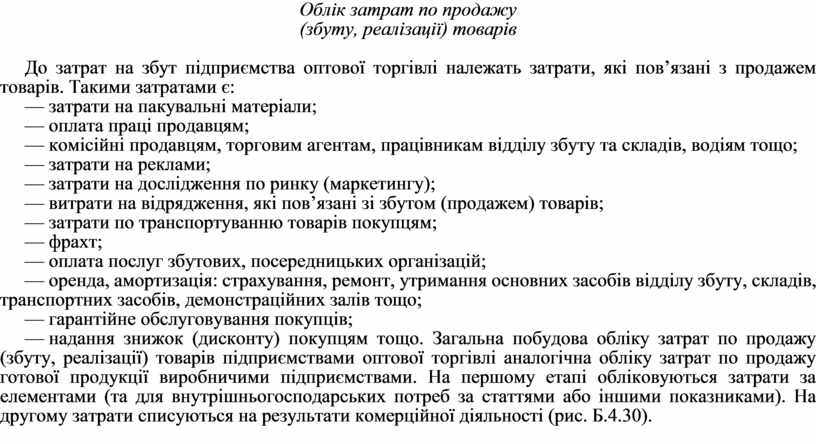 — надання знижок (дисконту) покупцям тощо. Загальна побудова обліку затрат по продажу (збуту, реалізації) товарів підприємствами оптової торгівлі аналогічна обліку затрат по продажу готової продукції виробничими підприємствами. На першому етапі обліковуються затрати за елементами (та для внутрішньогосподарських потреб за статтями або іншими показниками). На другому затрати списуються на результати комерційної діяльності (рис. Б.4.30).
