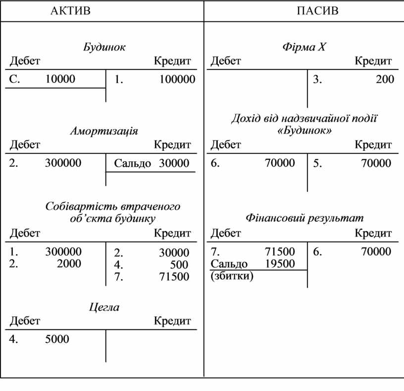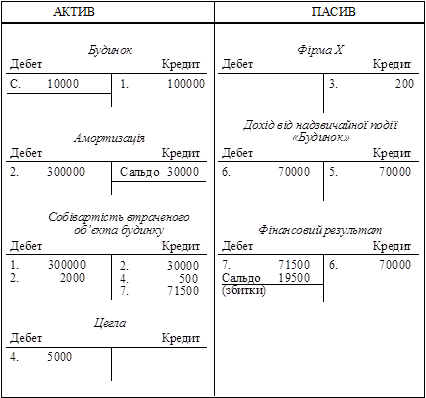 5. Відшкодування страховою компанією 70000 грн. Гроші надійшли в банк. Нижче наведена балансова інтерпретація бухгалтерських проведень по відображенню в обліку операцій по надзвичайній події (рис. Б.4.41).