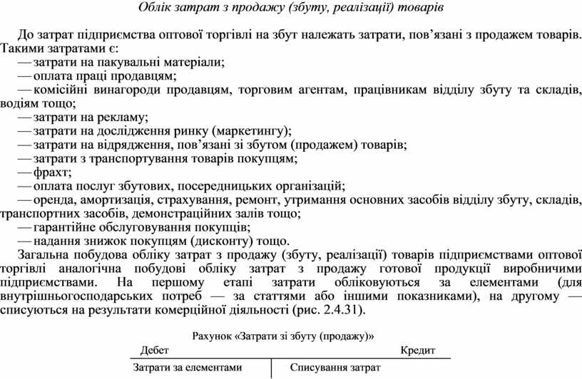 Загальна побудова обліку затрат з продажу (збуту, реалізації) товарів підприємствами оптової торгівлі аналогічна побудові обліку затрат з продажу готової продукції виробничими підприємствами. На першому етапі затрати обліковуються за елементами (для внутрішньогосподарських потреб — за статтями або іншими показниками), на другому — списуються на результати комерційної діяльності (рис. 2.4.31).