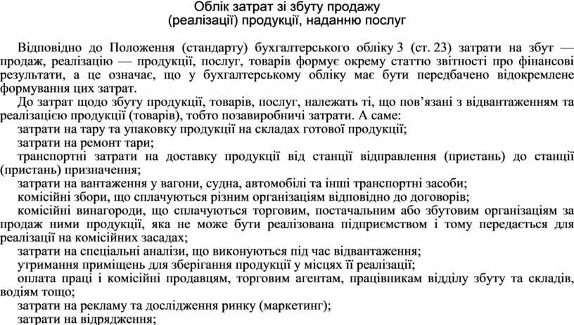 Відповідно до Положення (стандарту) бухгалтерського обліку 3 (ст. 23) затрати на збут — продаж, реалізацію — продукції, послуг, товарів формує окрему статтю звітності про фінансові результати, а це означає, що у бухгалтерському обліку має бути передбачено відокремлене формування цих затрат.