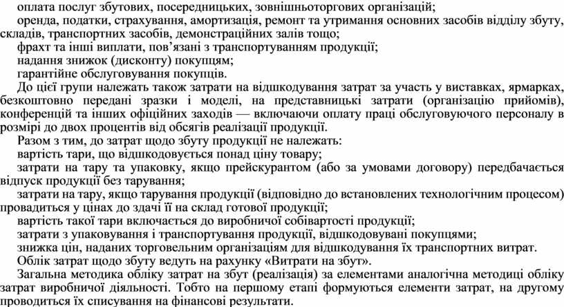 До затрат щодо збуту продукції, товарів, послуг, належать ті, що пов’язані з відвантаженням та реалізацією продукції (товарів), тобто позавиробничі затрати. А саме: