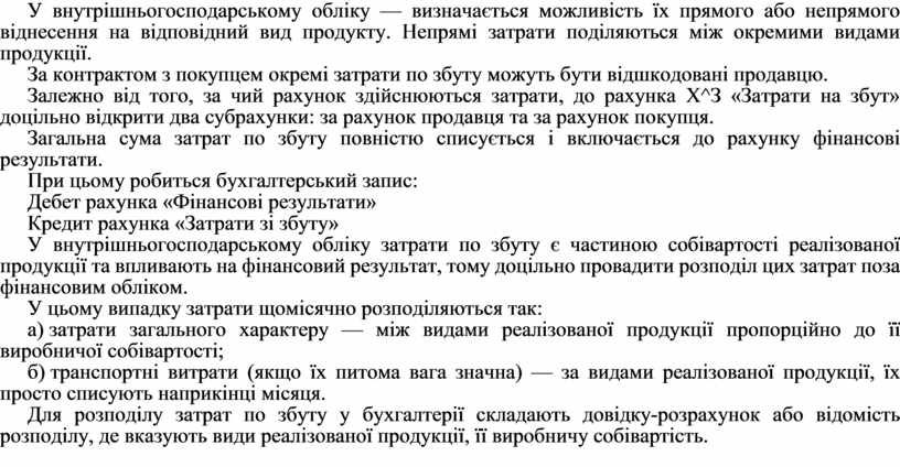 У внутрішньогосподарському обліку затрати по збуту є частиною собівартості реалізованої продукції та впливають на фінансовий результат, тому доцільно провадити розподіл цих затрат поза фінансовим обліком.