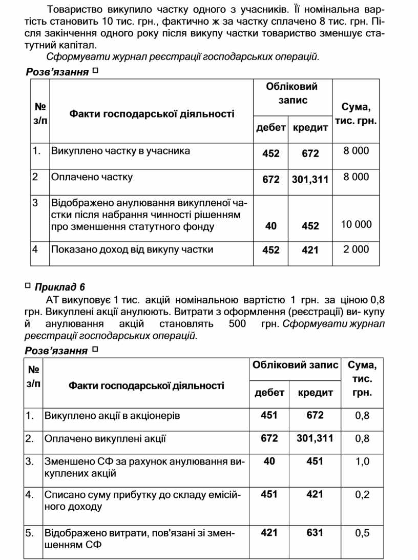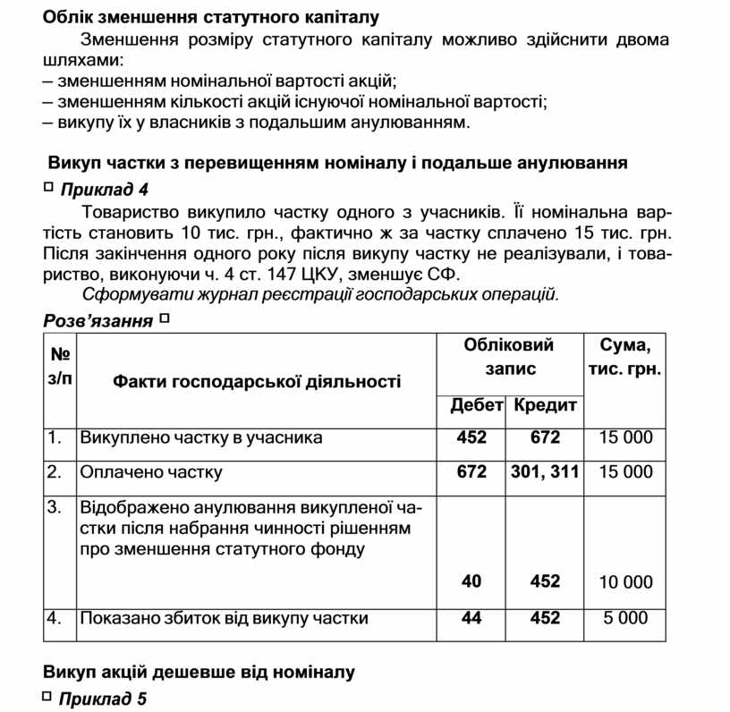 Товариство викупило частку одного з учасників. Її номінальна вар- тість становить 10 тис. грн., фактично ж за частку сплачено 8 тис. грн. Пі- сля закінчення одного року після викупу частки товариство зменшує ста- тутний капітал.