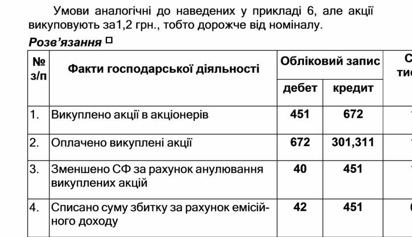 Умови аналогічні до наведених у прикладі 6, але акції викуповують за 1,2 грн., тобто дорожче від номіналу.