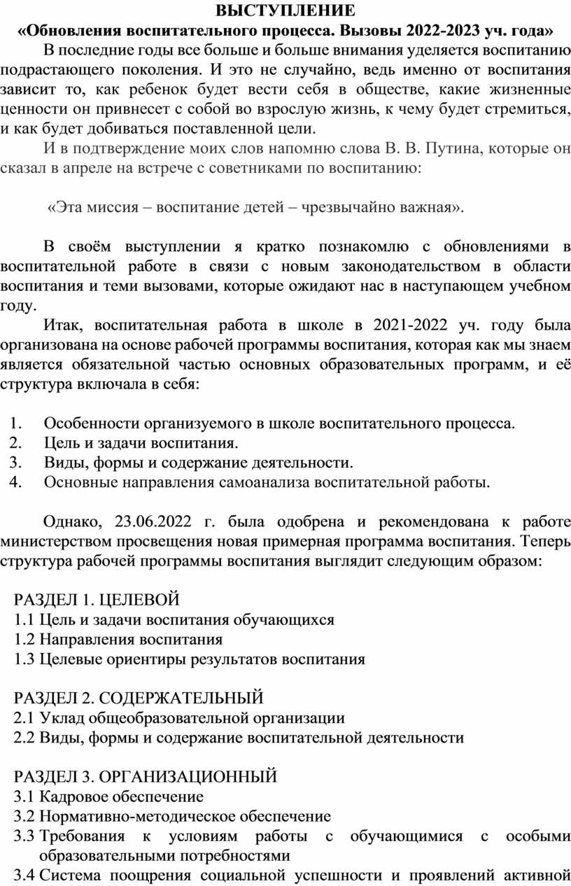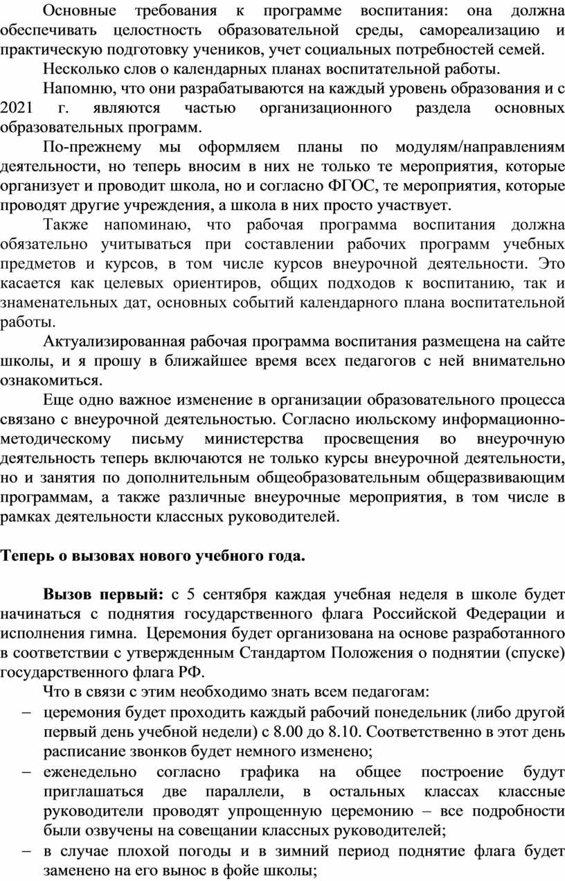 В своём выступлении я кратко познакомлю с обновлениями в воспитательной работе в связи с новым законодательством в области воспитания и теми вызовами, которые ожидают нас в наступающем учебном году.