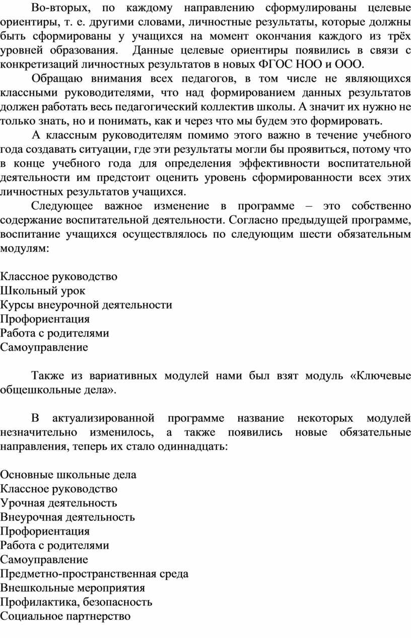 Следующее важное изменение в программе – это собственно содержание воспитательной деятельности. Согласно предыдущей программе, воспитание учащихся осуществлялось по следующим шести обязательным модулям: