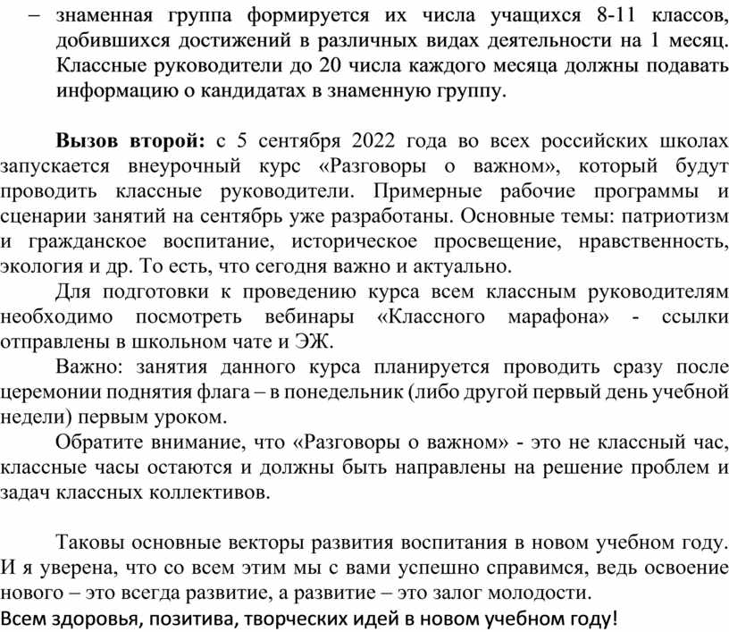 Вызов второй: с 5 сентября 2022 года во всех российских школах запускается внеурочный курс «Разговоры о важном», который будут проводить классные руководители. Примерные рабочие программы и сценарии занятий на сентябрь уже разработаны. Основные темы: патриотизм и гражданское воспитание, историческое просвещение, нравственность, экология и др. То есть, что сегодня важно и актуально.
