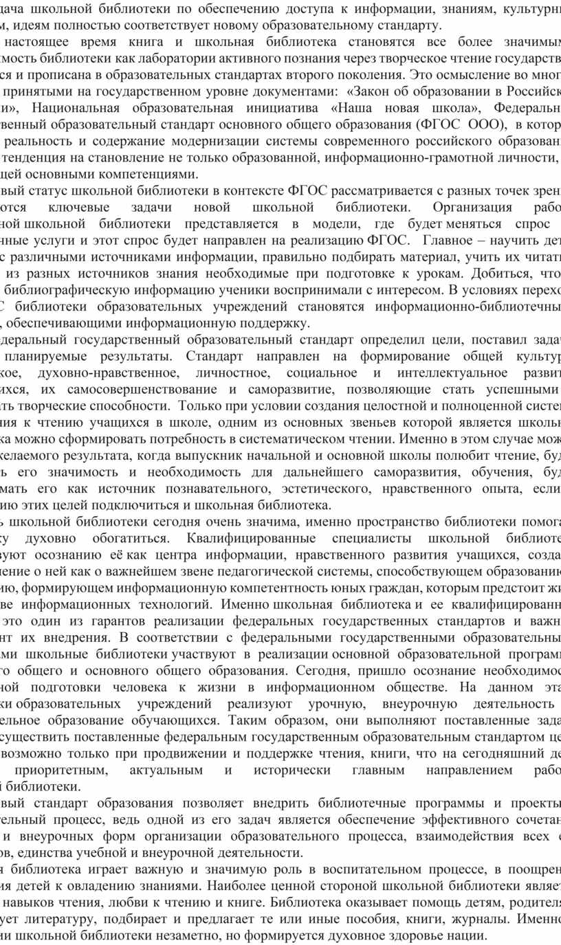 В настоящее время книга и школьная библиотека становятся все более значимыми. Необходимость библиотеки как лаборатории активного познания через творческое чтение государством понимается и прописана в образовательных стандартах второго поколения. Это осмысление во многом связано с принятыми на государственном уровне документами: «Закон об образовании в Российской Федерации», Национальная образовательная инициатива «Наша новая школа», Федеральный государственный образовательный стандарт основного общего образования (ФГОС ООО), в которых отражена реальность и содержание модернизации системы современного российского образования, намечена тенденция на становление не только образованной, информационно-грамотной личности, но и владеющей основными компетенциями.